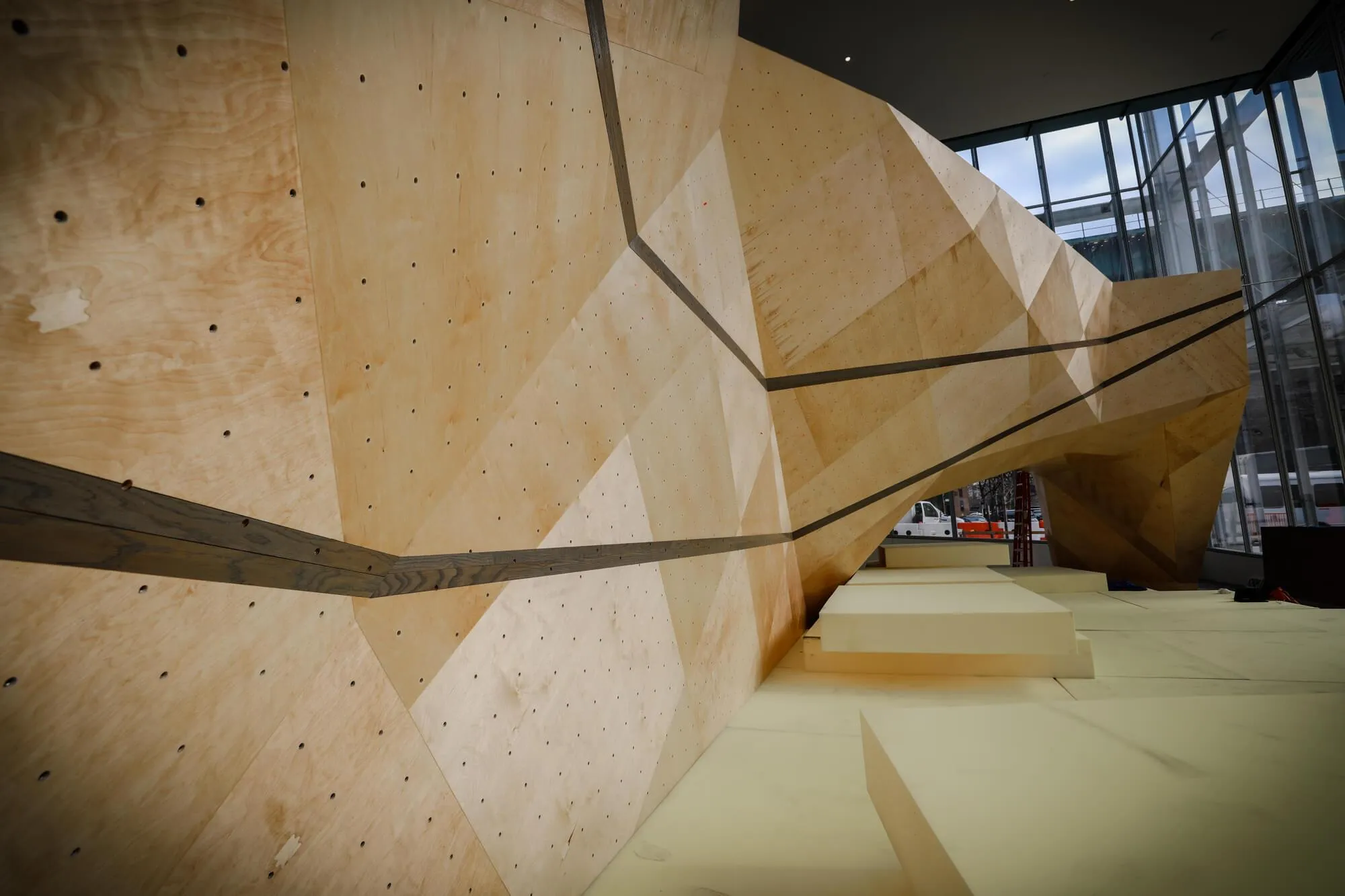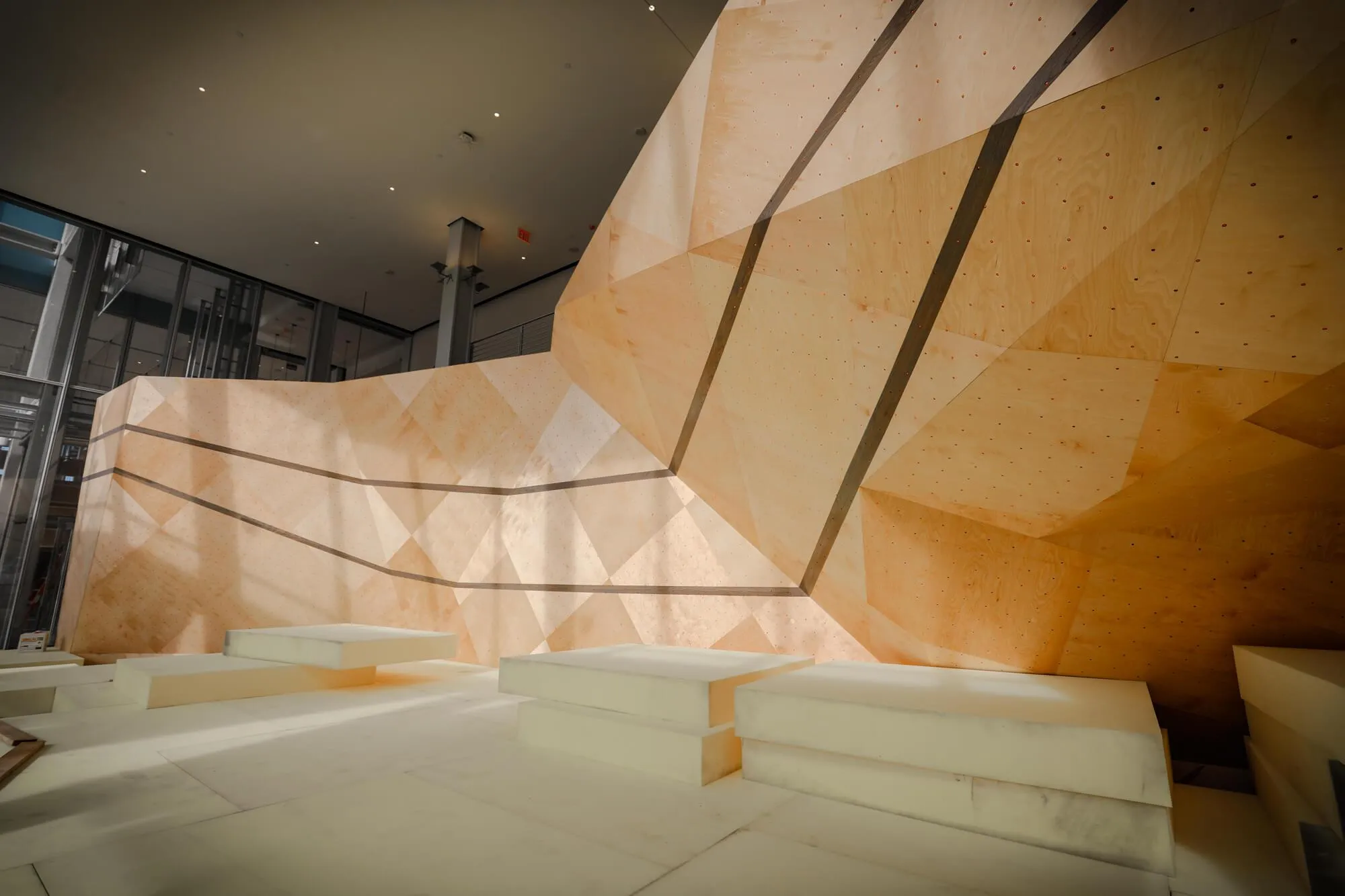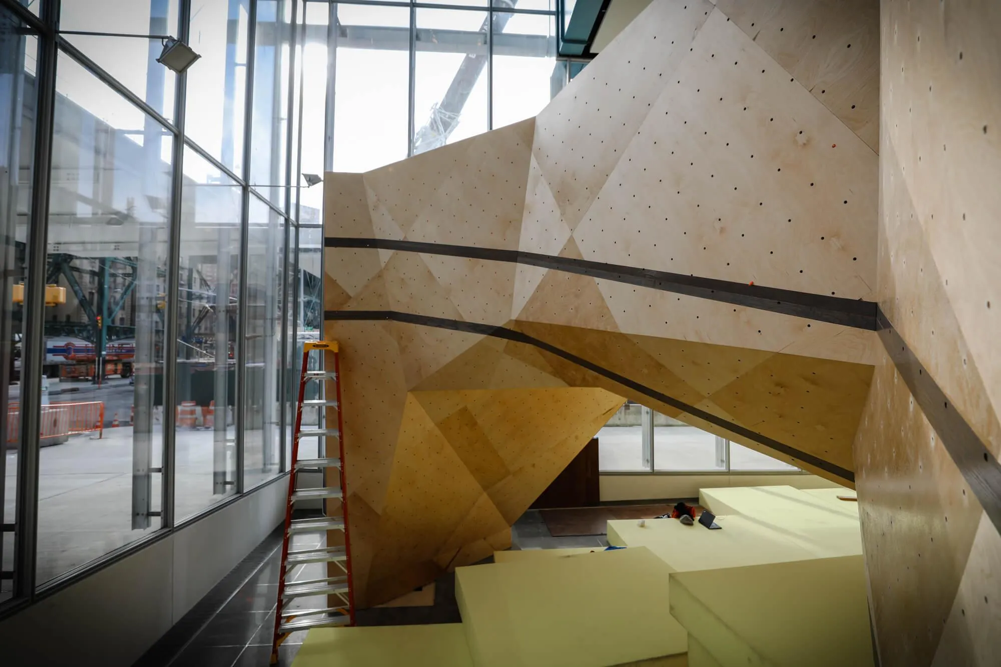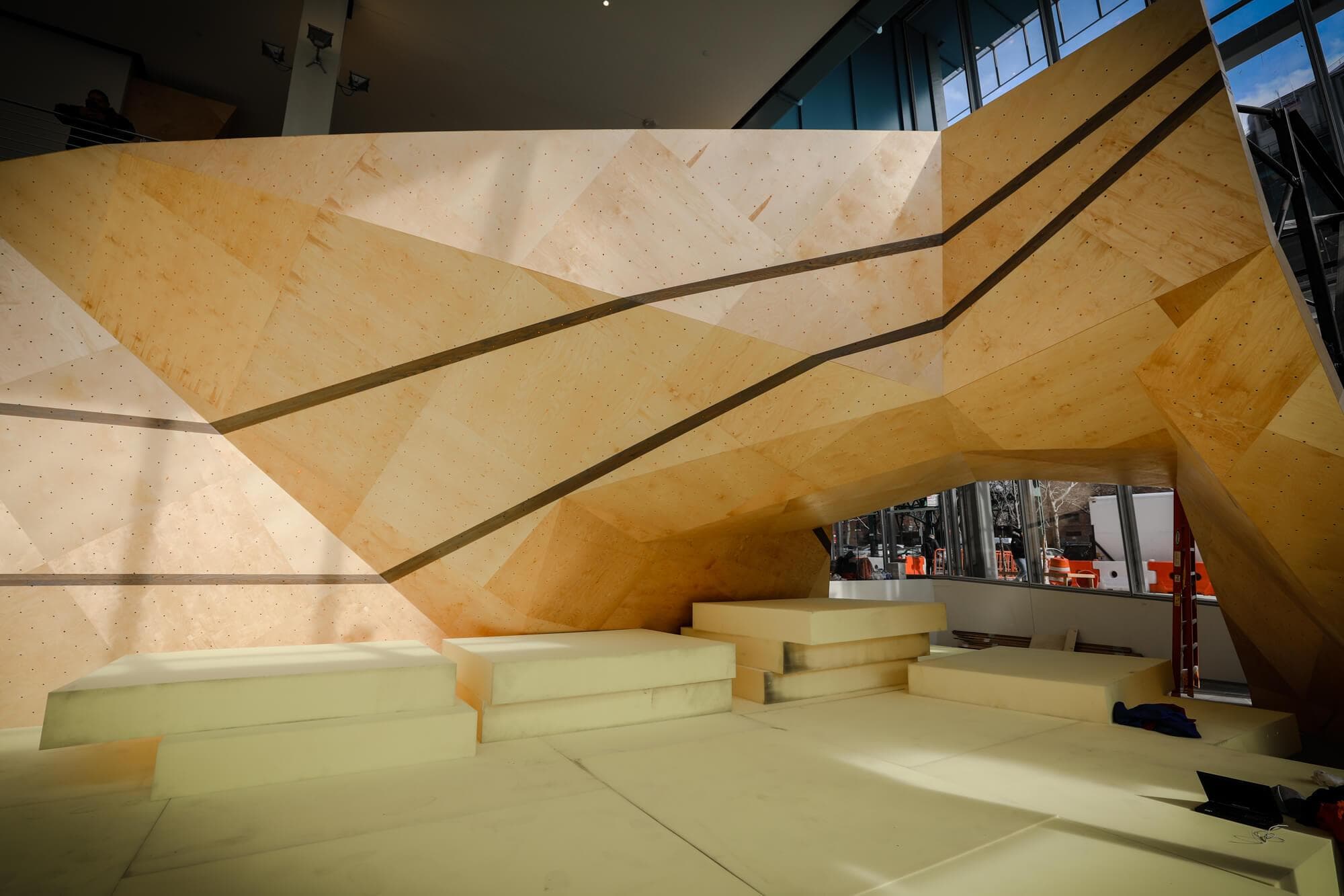 The photo set below gives you a rare insider’s look into a climbing wall project that is in that transition period between complex interior architecture, and a structure specifically designed to be functional for end-users. When stripped down to the bare structure without climbing holds, volumes, and witness marks of climbers’ usage, you can really see how the design is meant to compliment the space, produce a certain flow and feel, and ultimately still be rewarding to passers-by outside.