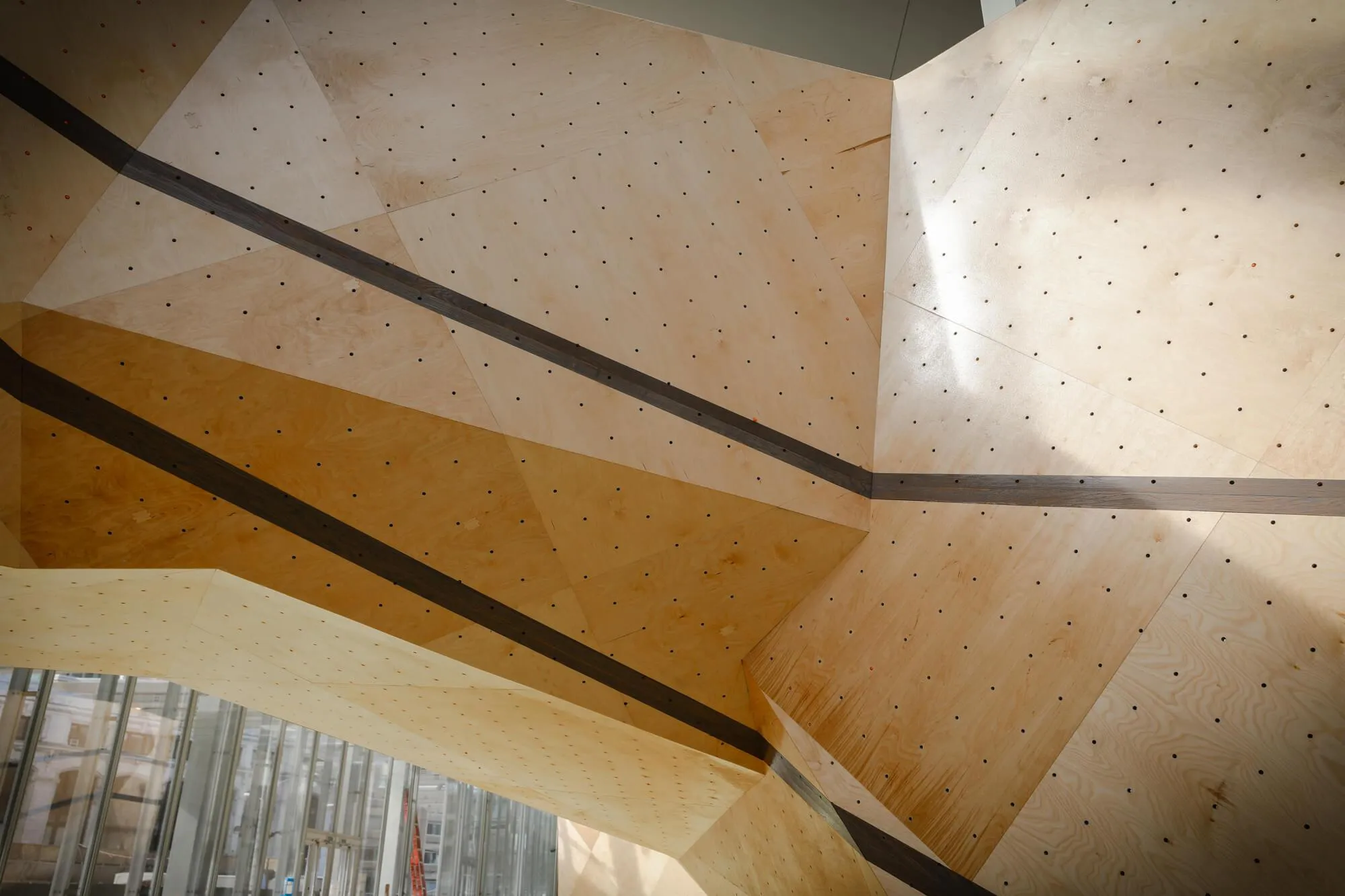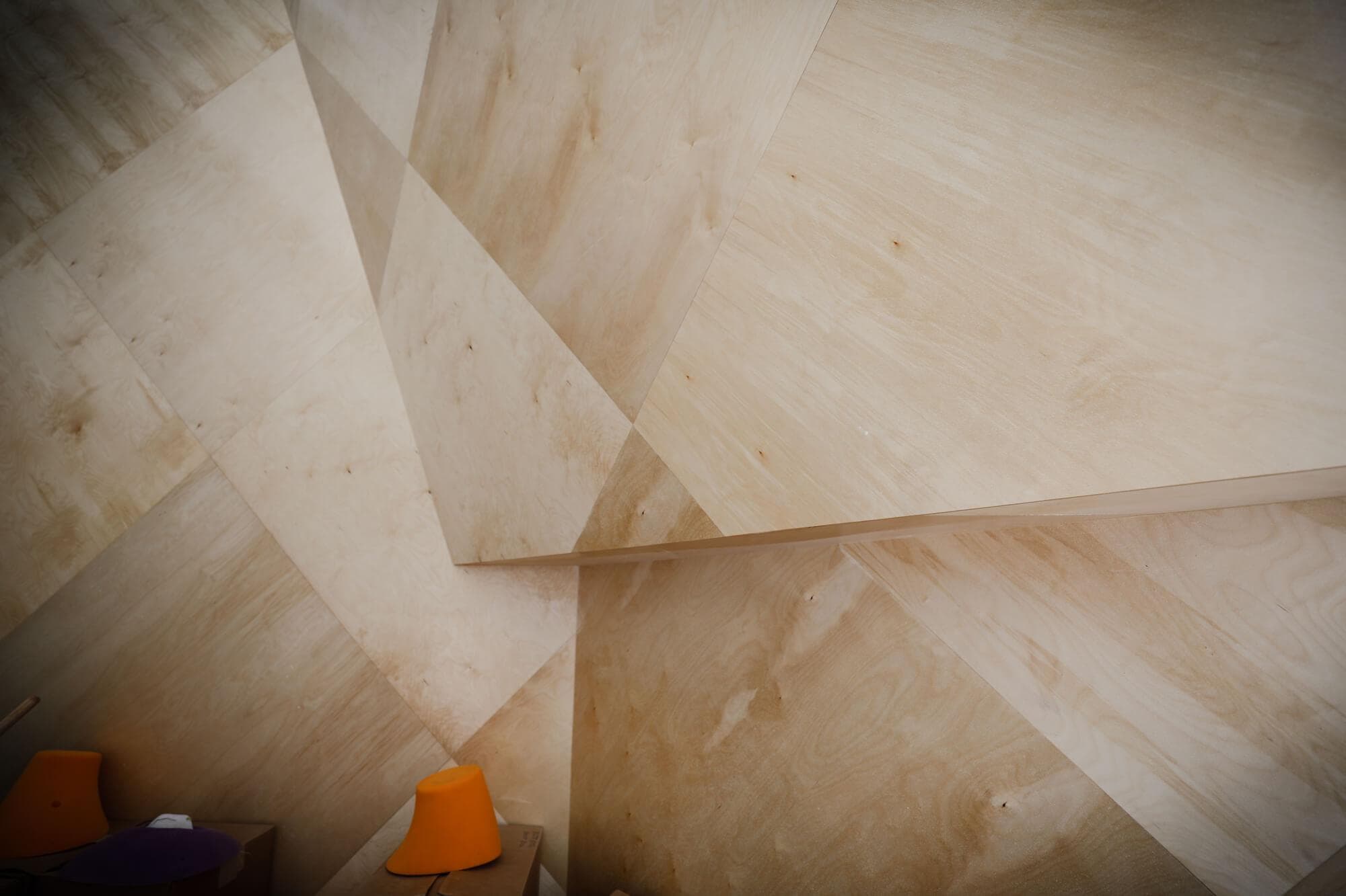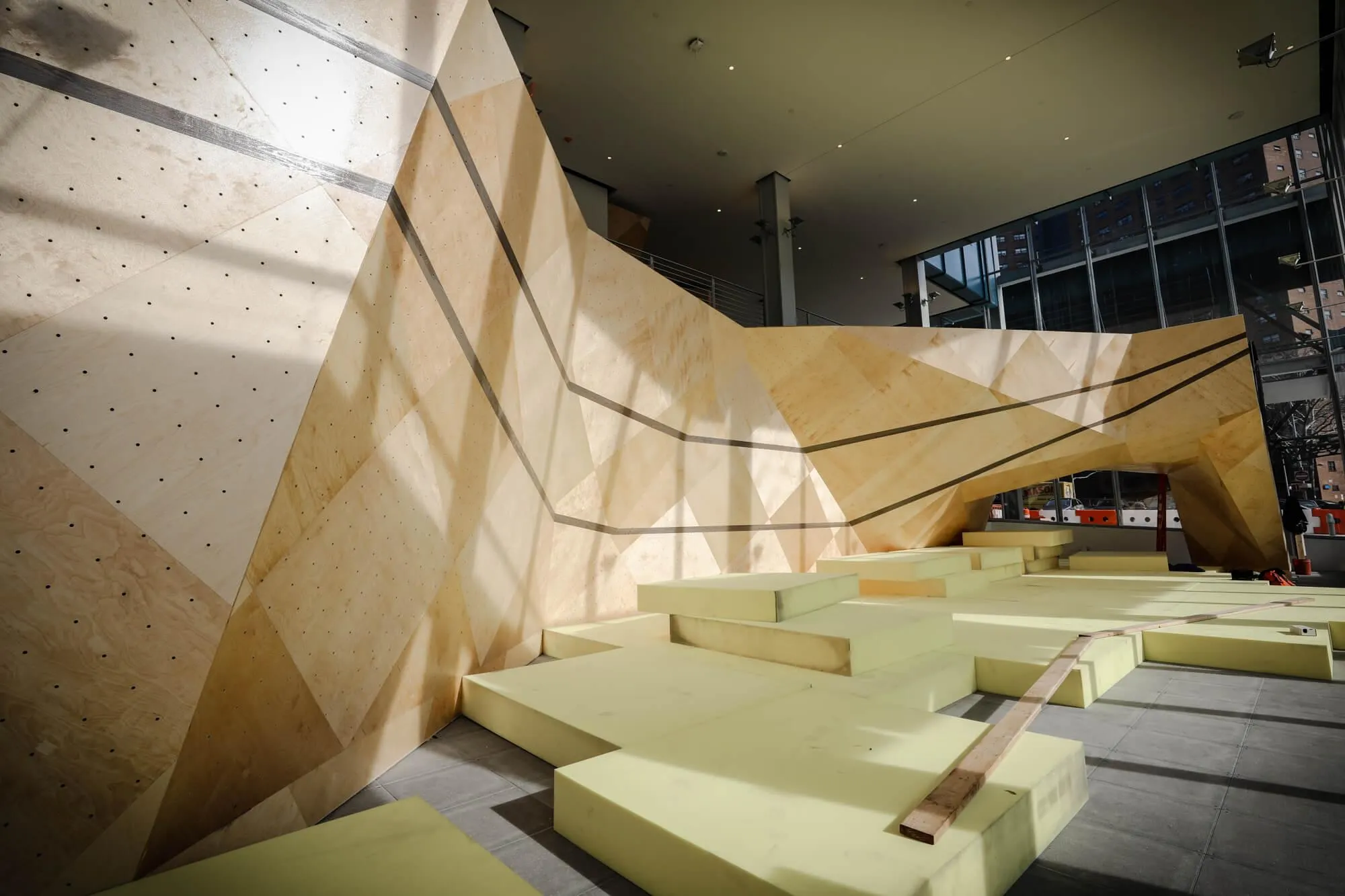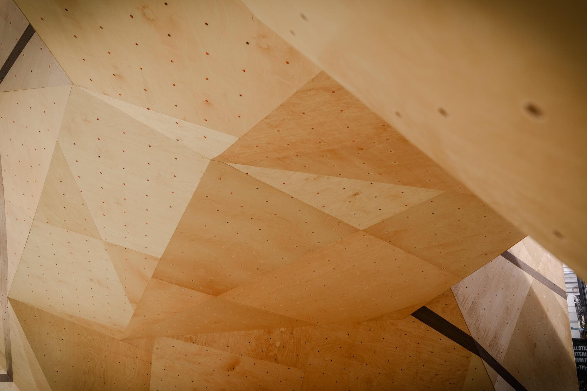 The photo set below gives you a rare insider’s look into a climbing wall project that is in that transition period between complex interior architecture, and a structure specifically designed to be functional for end-users. When stripped down to the bare structure without climbing holds, volumes, and witness marks of climbers’ usage, you can really see how the design is meant to compliment the space, produce a certain flow and feel, and ultimately still be rewarding to passers-by outside.