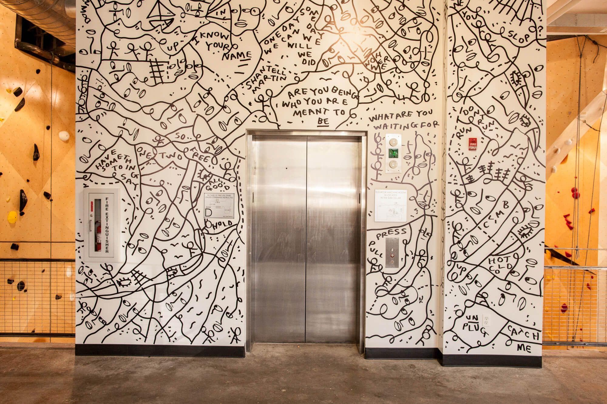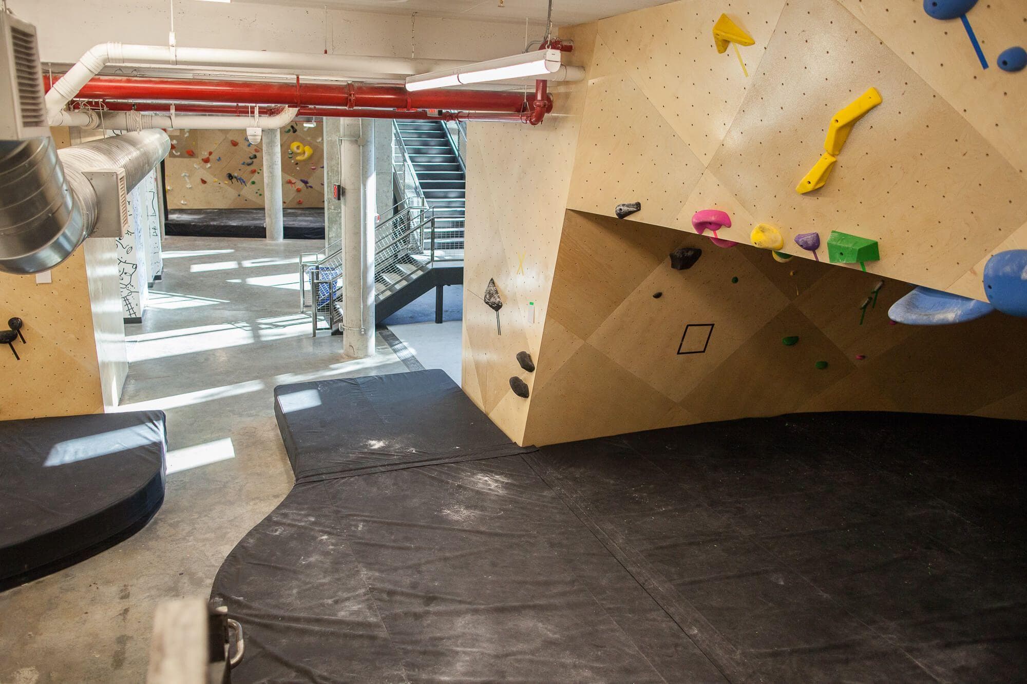 Brooklyn Boulders' innovative fourth facility thrives on the lower floors of a high-rise building in the Long Island City neighborhood of Queens, New York. BKB's 25,000 square-foot Queensbridge location features bouldering, rope climbing, and autobelays on varied terrain, along with yoga classes, fitness programs, personal training, saunas, a dynamic and collaborative coworking space, and an art gallery.