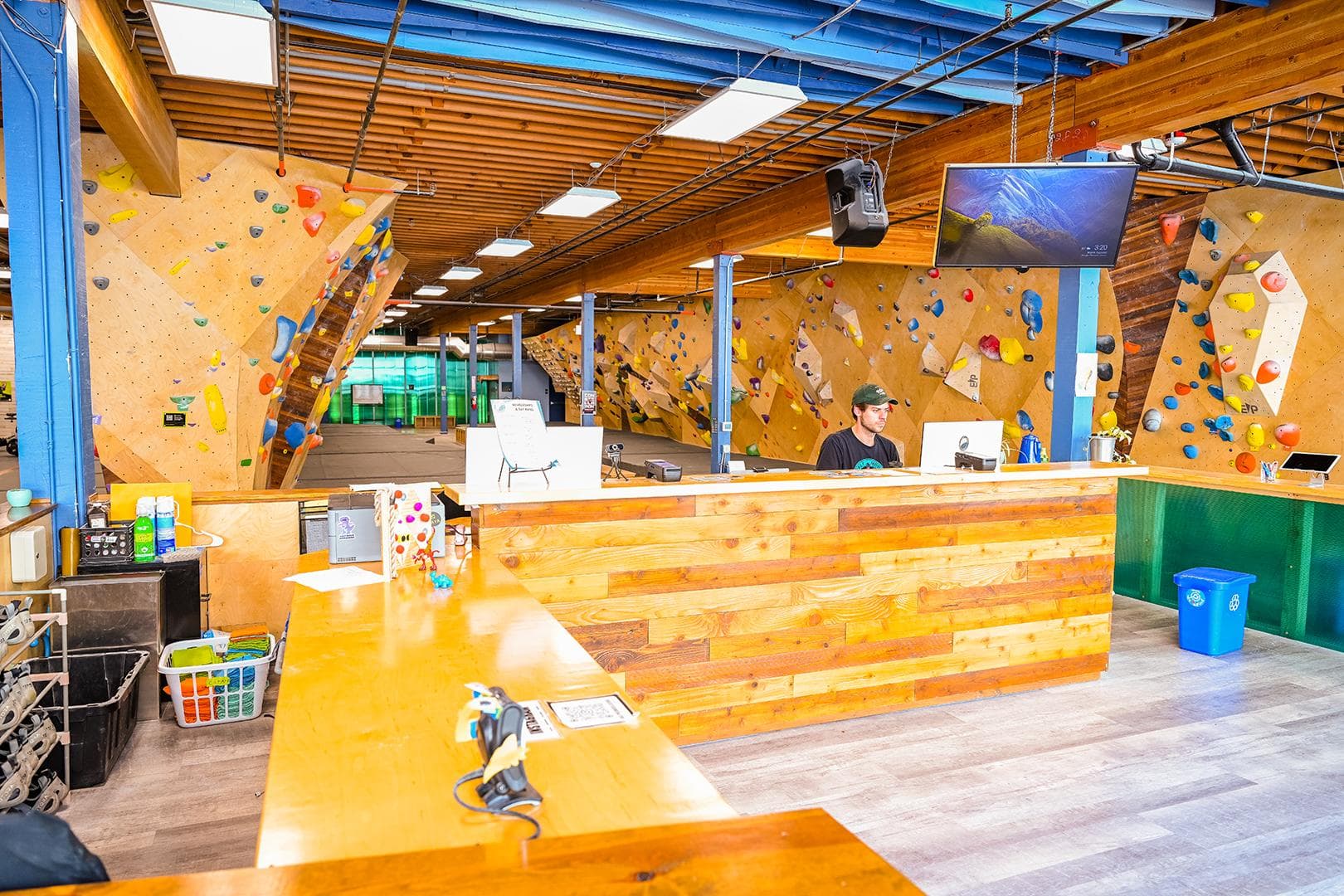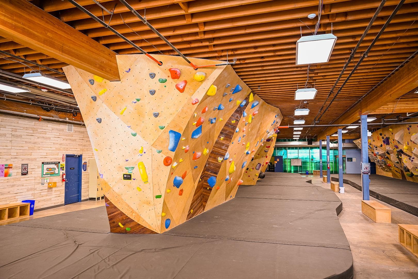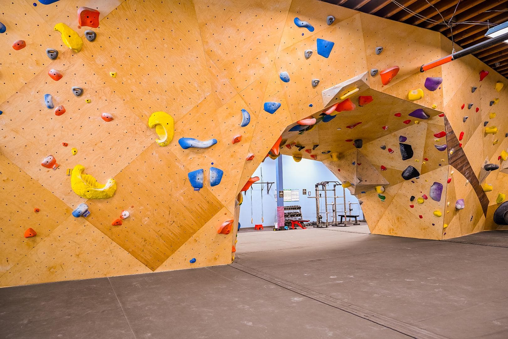 "Family owned, community focused" says it all! Half Moon Bouldering is a hub for climbers of all levels, whether you're new, experienced, have your kids, or are looking to train insane. A custom tonal wood front desk greet visitors, who are then swept away to the curvaceous beauty of their central bouldering arch. With bouldering, yoga, kids climbing zones, weight and climbing-specific training areas, and social spaces, we get why everyone's over-the-moon about this urban bouldering spot.