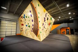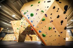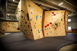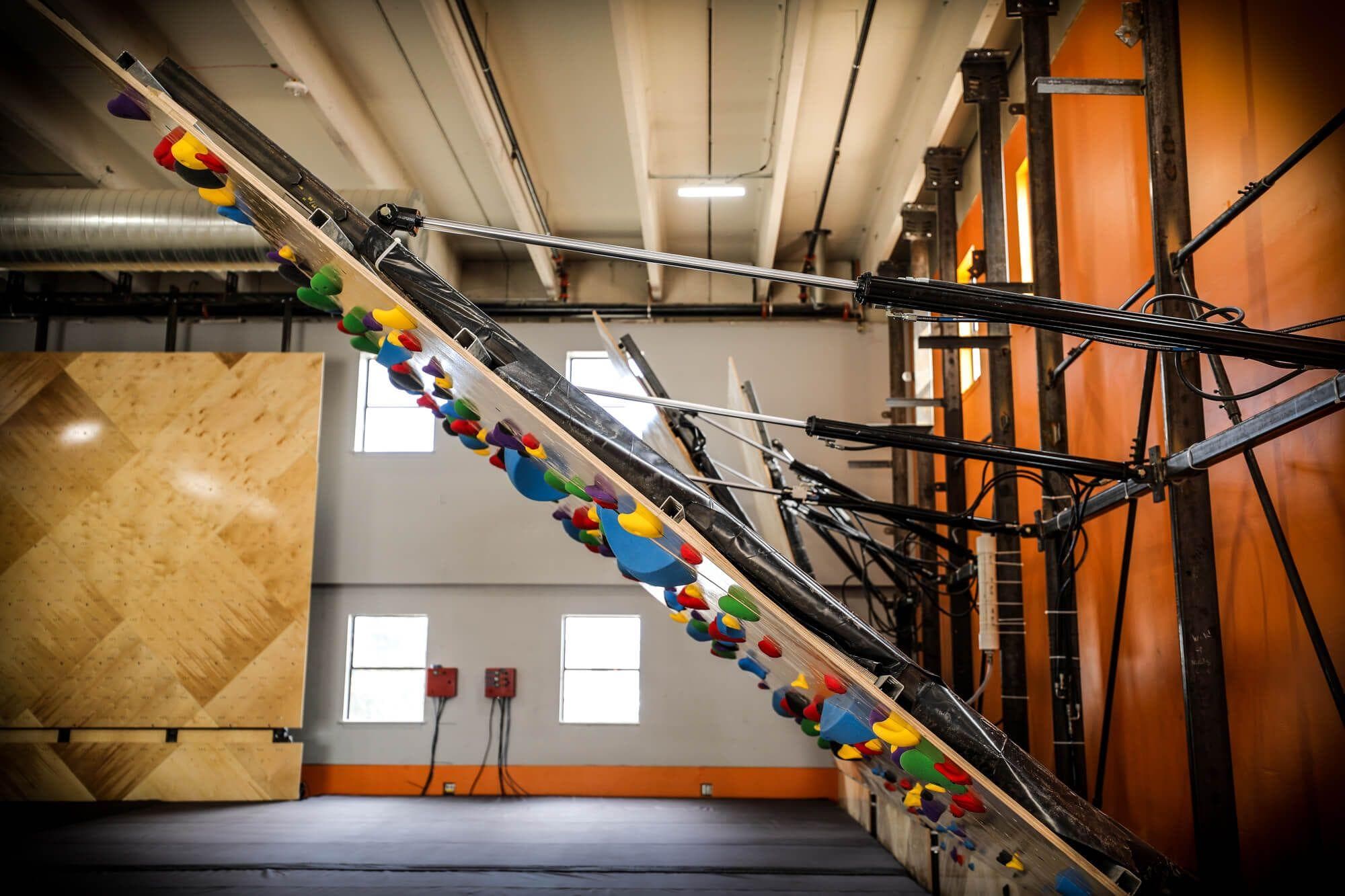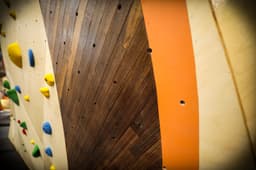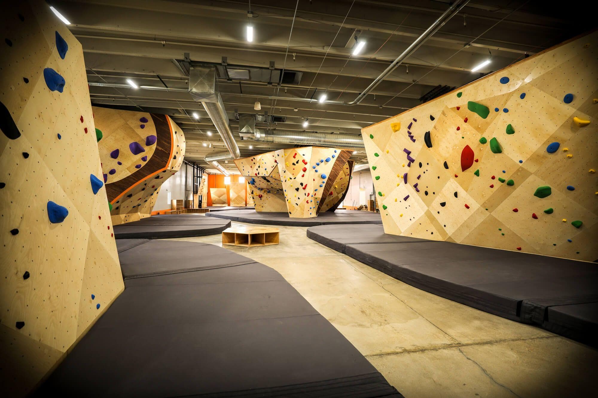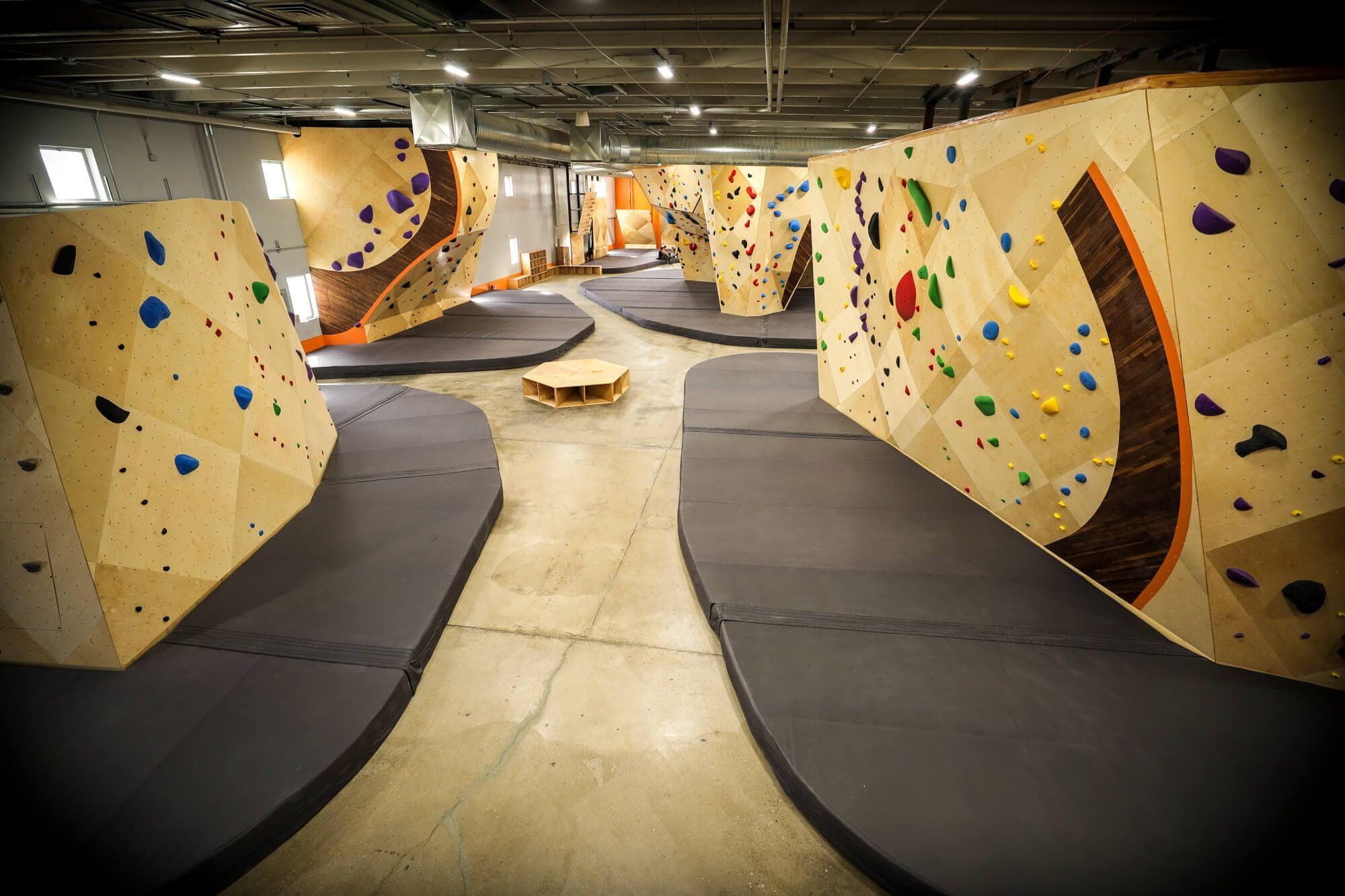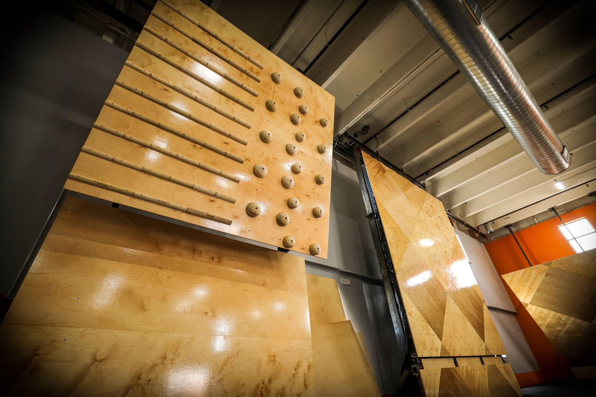 The use of hardwood accents on the climbing walls at this gym is one its most defining brand characteristics.
