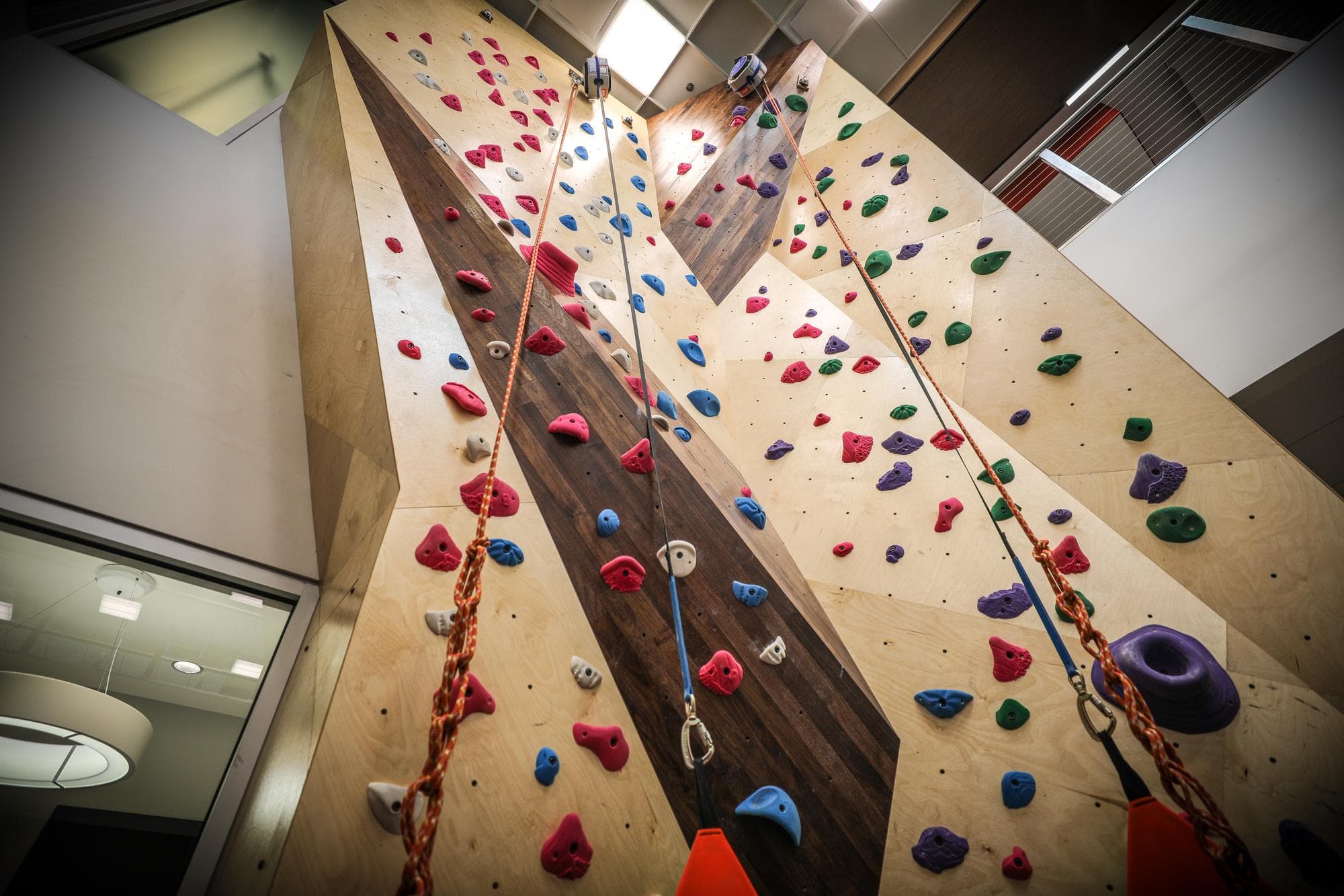 This economically-sized two-anchor wall is the place to be on lunch break. Stylish wood inlay and Vertical Solution's trademark birch diamonds add an artistic centerpiece to a workplace and inspire an active lifestyle and teambuilding without even leaving the premises. Goodbye waiting room chic, hello best office ever!