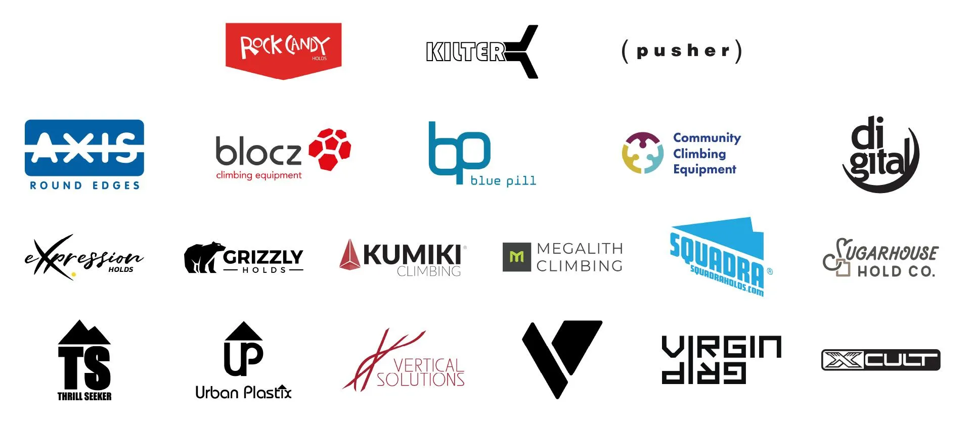 Rock Candy | Kilter | Pusher | Axis | Blocz | BluePill | Community Climbing Equipment | Digital Climbing | eXpression | Grizzly | Kumiki | Megalith | Squadra | Sugarhouse | Thrill Seeker | Urban Plastix | Vertical Solutions | Vezi | Virgin Grip | Xcult