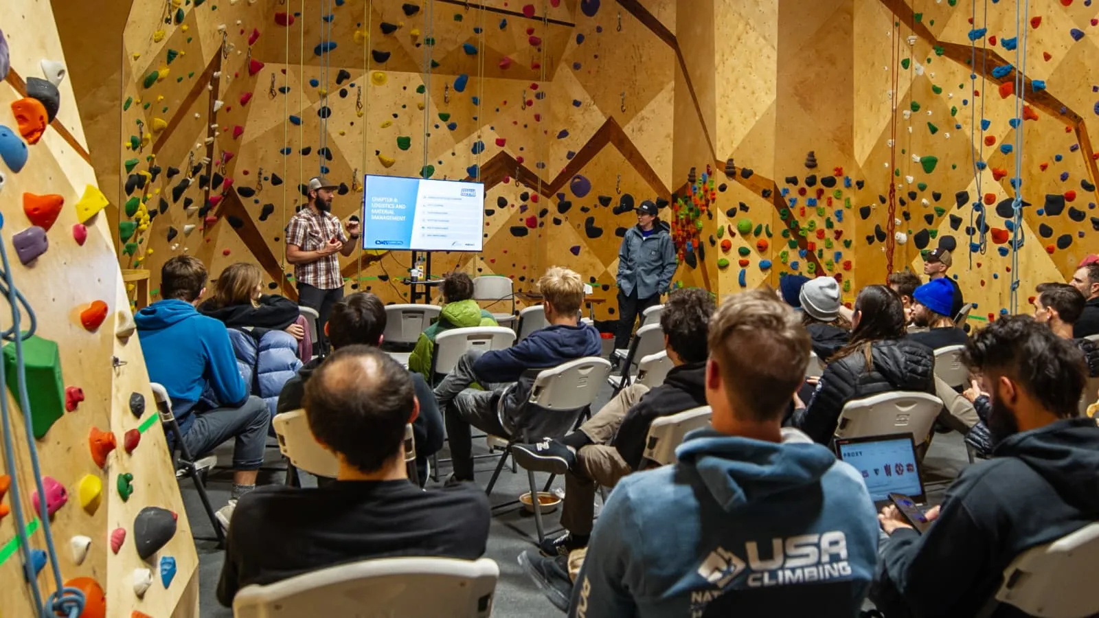 As route setting is a hands-on job, it was only appropriate to balance our classes between the wall and traditional schoolroom-style classes. So, we started our days in the Setter Summit Classroom, practicing management skills and partaking in design discussions, and spent our afternoons on the wall, running through real-time routing exercises.