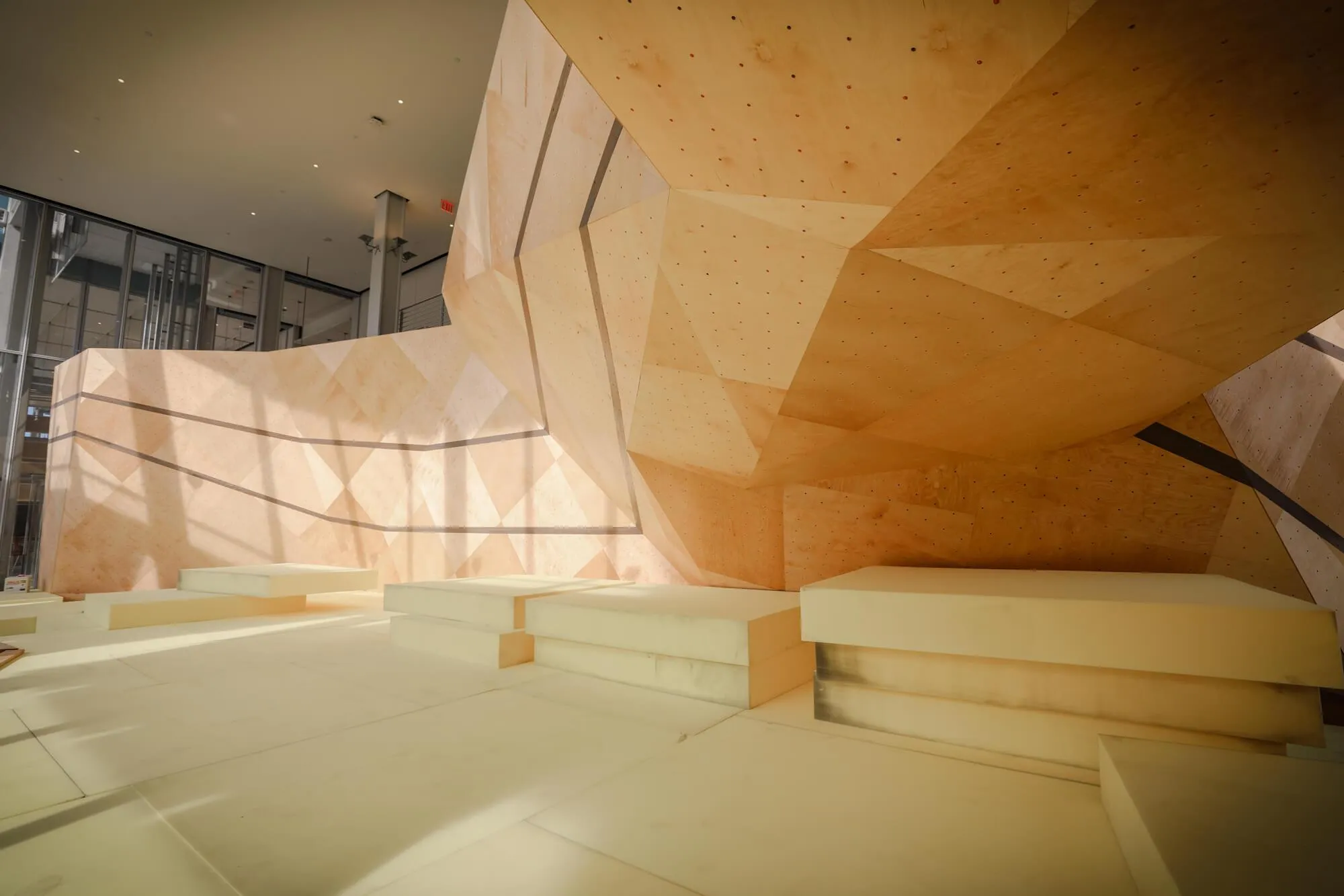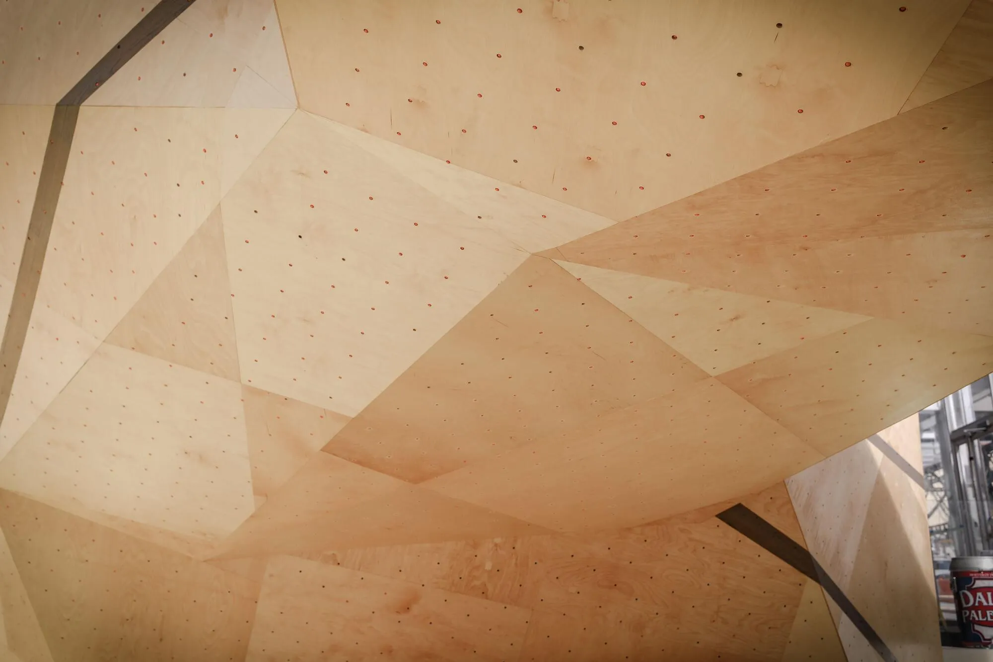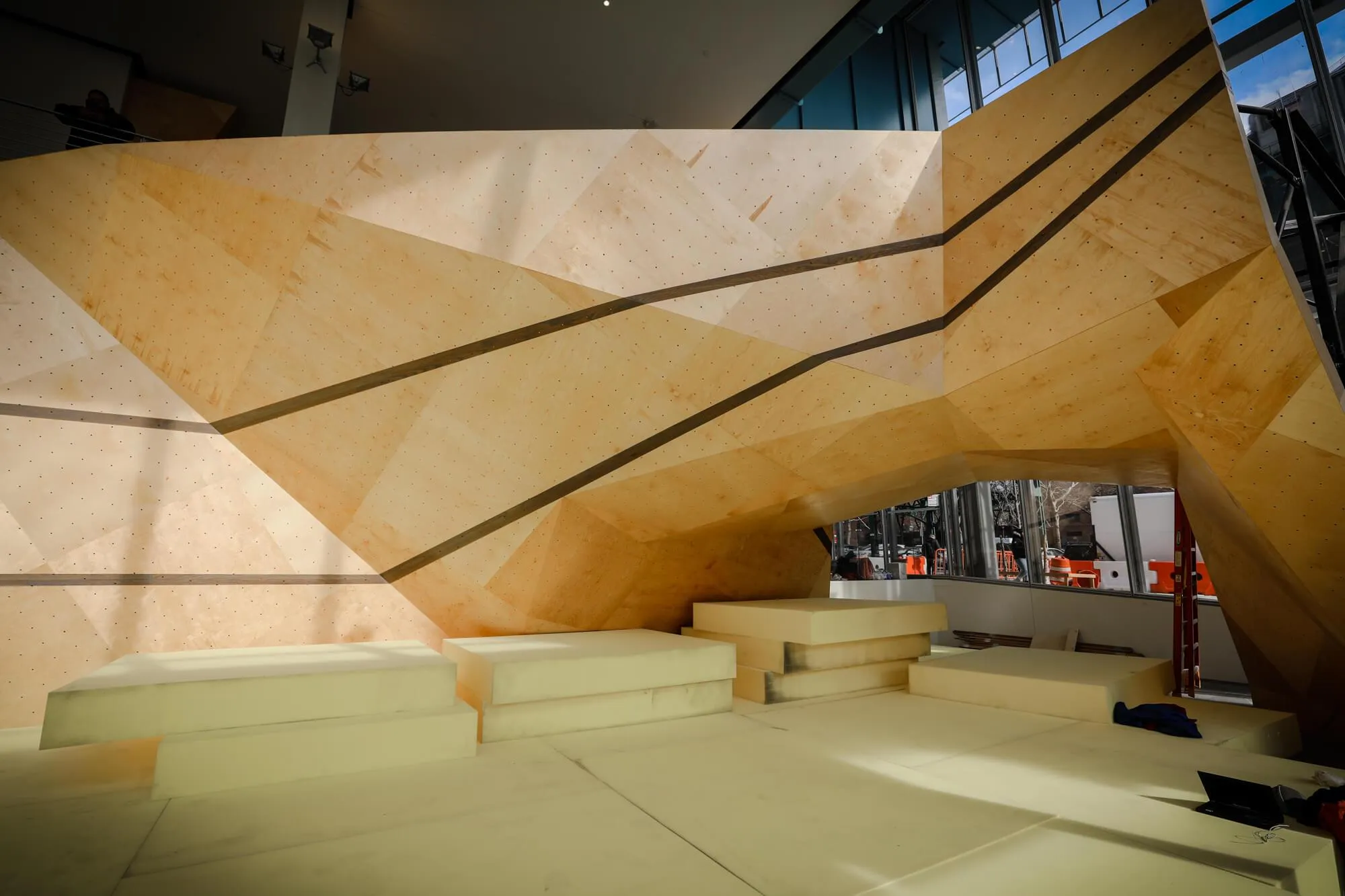 The photo set below gives you a rare insider’s look into a climbing wall project that is in that transition period between complex interior architecture, and a structure specifically designed to be functional for end-users. When stripped down to the bare structure without climbing holds, volumes, and witness marks of climbers’ usage, you can really see how the design is meant to compliment the space, produce a certain flow and feel, and ultimately still be rewarding to passers-by outside.