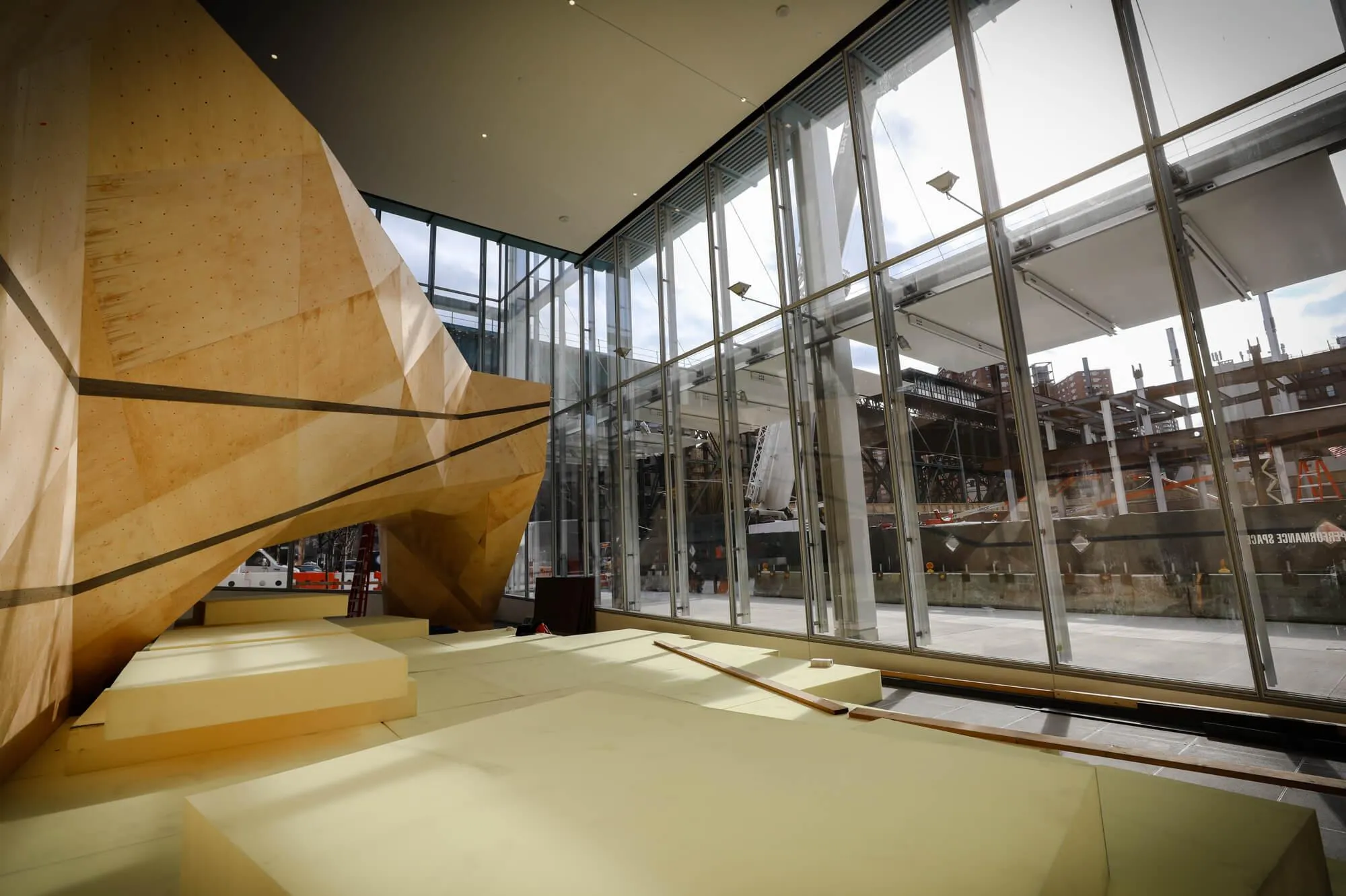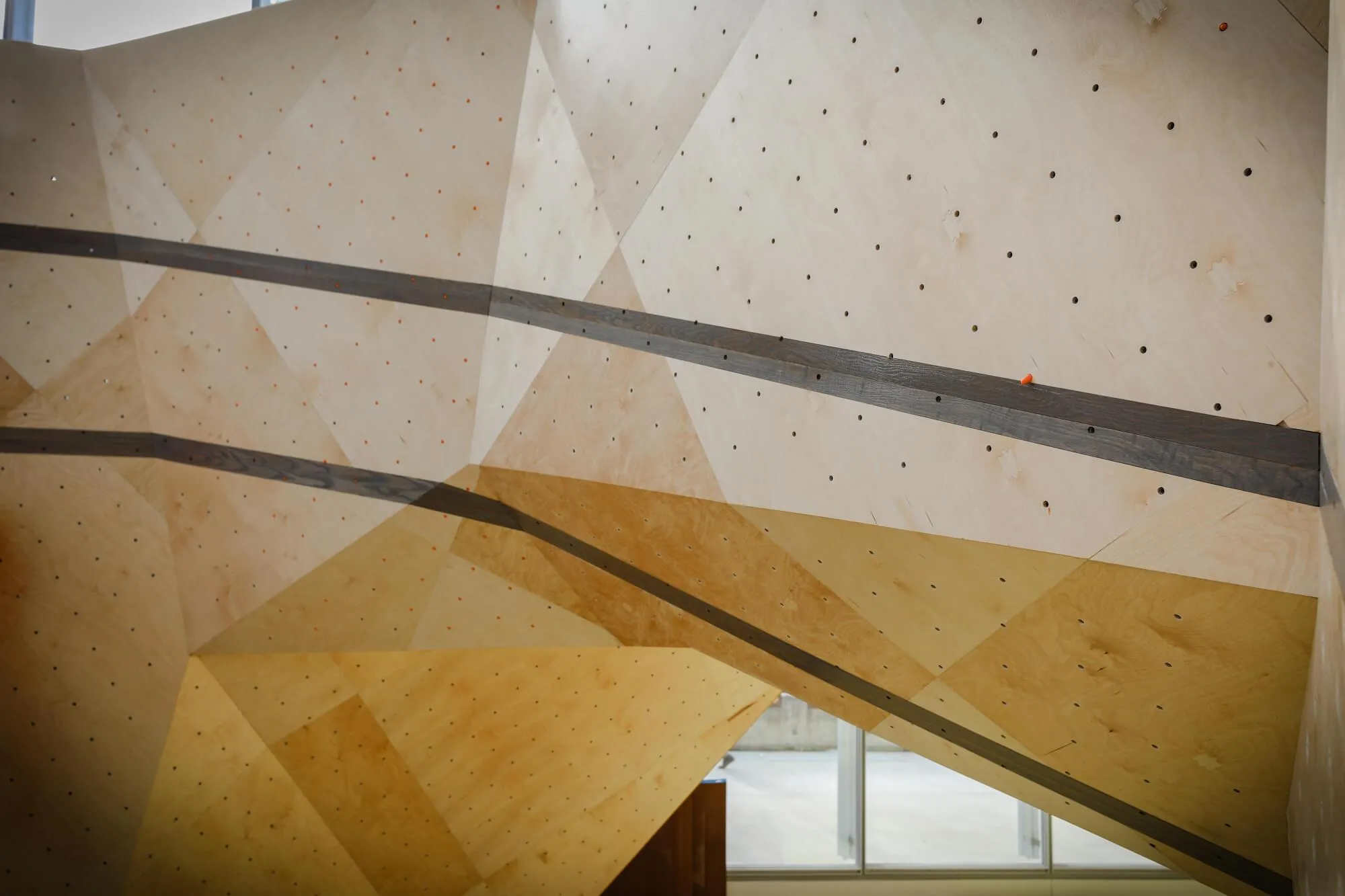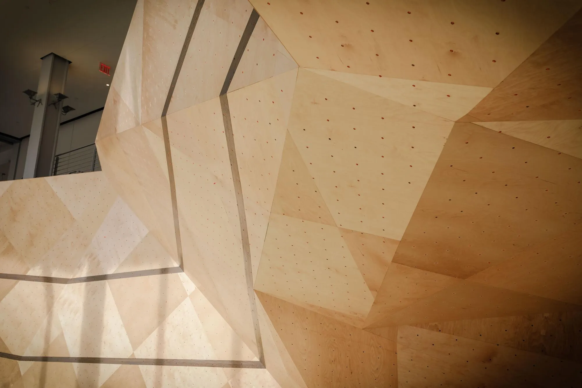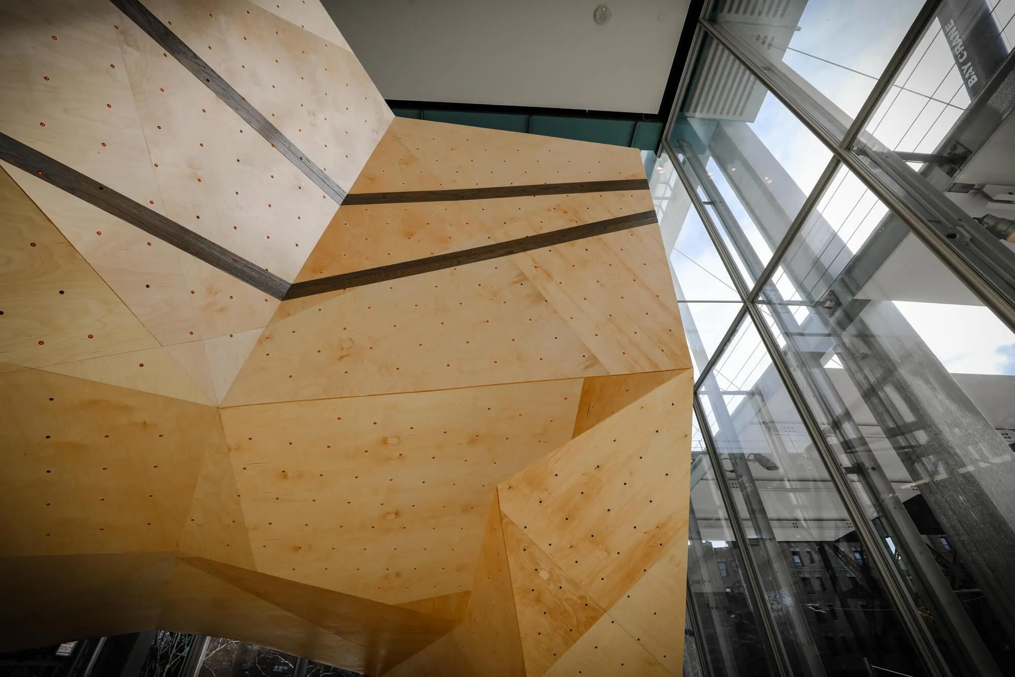 The photo set below gives you a rare insider’s look into a climbing wall project that is in that transition period between complex interior architecture, and a structure specifically designed to be functional for end-users. When stripped down to the bare structure without climbing holds, volumes, and witness marks of climbers’ usage, you can really see how the design is meant to compliment the space, produce a certain flow and feel, and ultimately still be rewarding to passers-by outside.