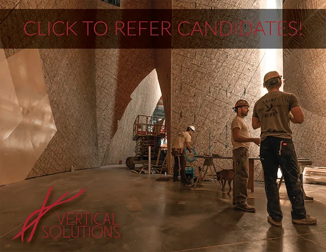 Vertical Solutions, the nation’s leading one-stop solution provider for indoor climbing walls, floors, holds, and business consulting, is launching a new industry referral program to aide the expansion of their climbing wall construction crews. Manufacturing climbing products and building climbing gyms requires that employees not only posses job-specific skills, but also satisfy the right mindset and culture-fit to successfully fill roles. The specialization of the climbing gym business lends itself to employees that have an intimate passion to match their abilities, and Vertical Solutions has no shortage of opportunities available for candidates matching that description, with a full schedule already set for 2017 going well into 2018.